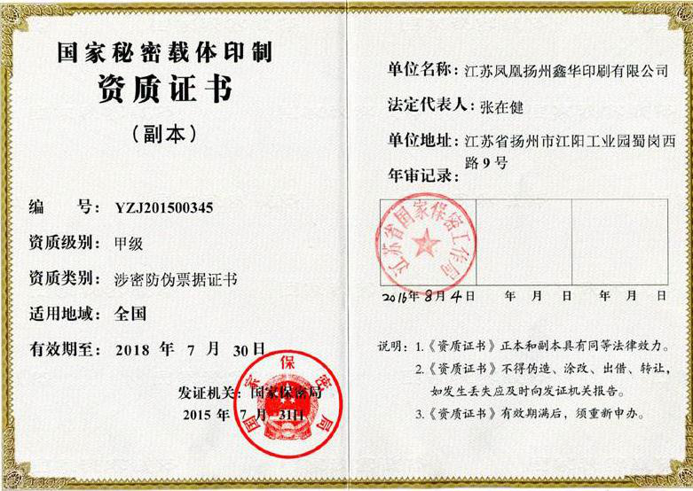 國家秘密載體印製資質分為甲級和乙級兩個等級。甲級資質單位可以在全國範圍內承擔絕密級、機密級、秘密級囯家秘密載體印製業務;乙級資質單位可以在工商注冊地省 (自治區、直轄市)行政區域內承擔機密級、秘密級國家秘密載體印製業務。乙級資質單位跨省(自治區、直轄市)承接國家秘密載體印製業務的,應當經委托印製業務的機關、單位所在地省 (自治區、直轄市)保密行政管理部門批準。